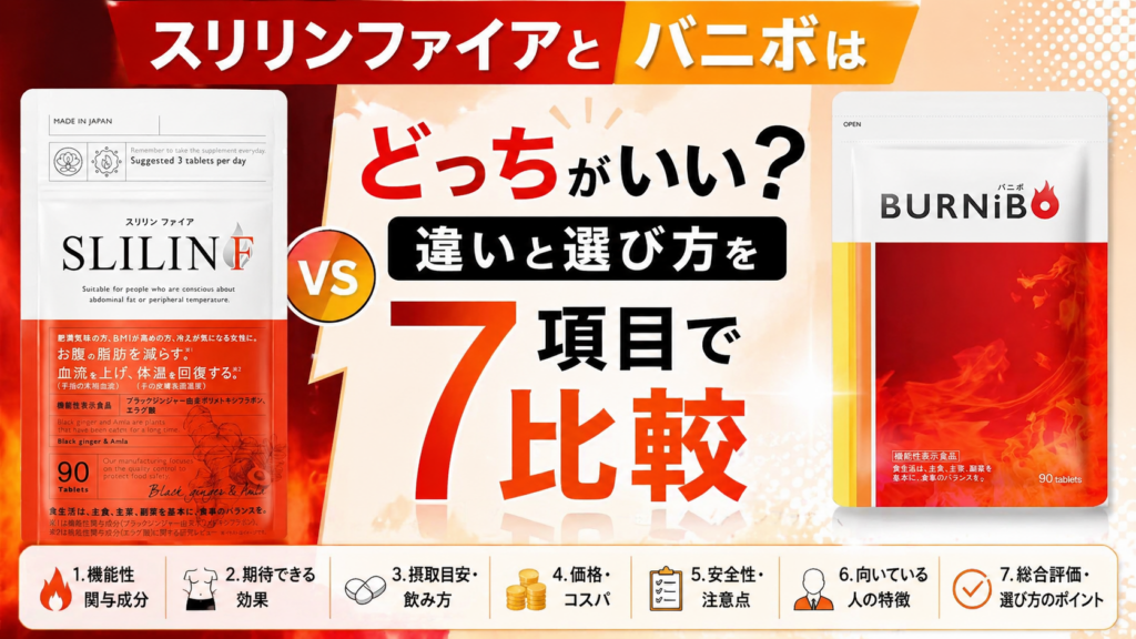 この記事では、スリリンファイアとバニボを比較したい方に向けて、機能性表示の違い、向いている人、価格や定期条件まで、購入前に見ておきたいポイントを順番に整理します。 結論からいうと、冷えや体温低下が気になりやすく、日常生活の中で使いやすさを... ダイエット
