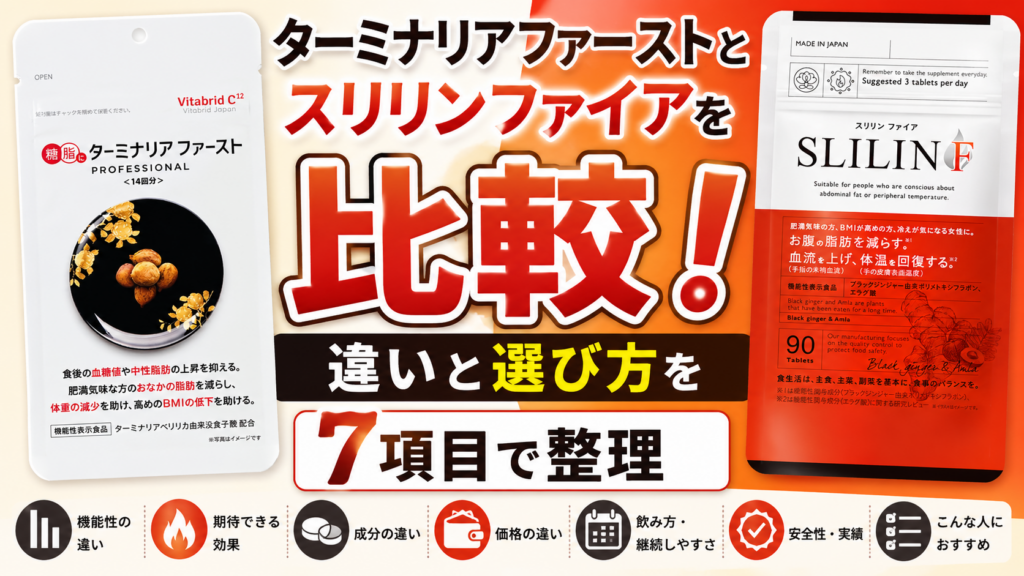 この記事では、ターミナリアファーストとスリリンファイアの違いを、機能性表示や成分、飲み方、価格感まで含めて比較し、どちらを選ぶべきか判断しやすい形で整理します。 結論からいうと、食事の糖や脂肪対策を中心に考えるならターミナリアファースト、... ダイエット