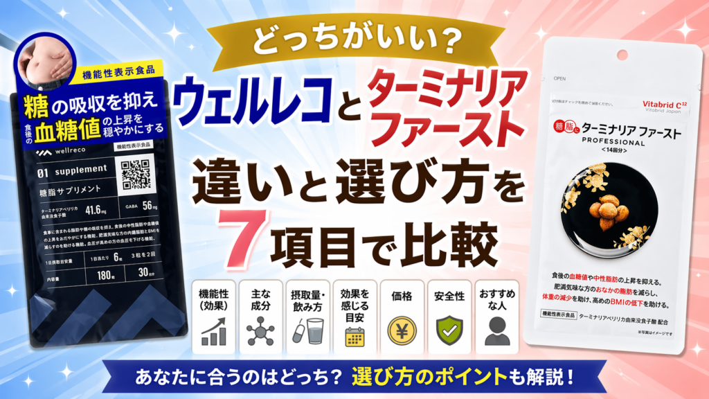 この記事では、ウェルレコとターミナリアファーストで迷っている方向けに、公式情報をもとに違いと選び方を整理します。 両方とも糖や脂肪に着目した機能性表示食品ですが、設計思想はかなり異なります。 結論からいうと、体の状態を見える化しながら生活... -