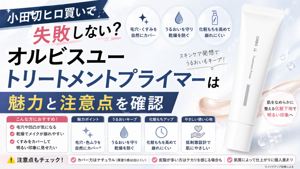 この記事では、オルビスユー トリートメントプライマーが小田切ヒロさんきっかけで気になっている方に向けて、商品の特徴と購入前に見ておきたい注意点を整理します。 結論からいうと、オルビスユー トリートメントプライマーは、毛穴や乾燥による小じわを... -