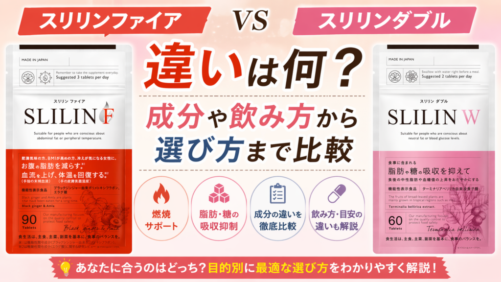 この記事では、スリリンファイアとスリリンダブルの違いについて、成分や機能性、飲むタイミング、選び方まで比較しながら整理します。 結論からいうと、運動や日常活動の中で脂肪対策を考えたいならスリリンファイア、食事に含まれる脂肪や糖が気になるな... -