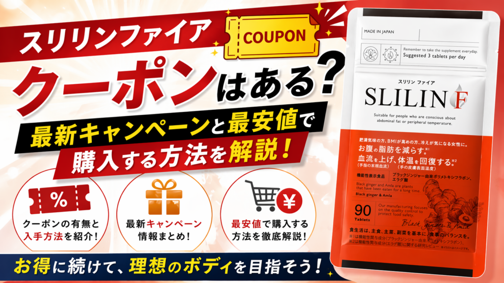 この記事では、スリリンファイアのクーポン情報や最新キャンペーン、お得に購入する方法について解説します。 現在スリリンファイアには一般的なクーポンコードは確認されていませんが、公式サイトの定期コースで購入することで通常価格より安く購入するこ... -