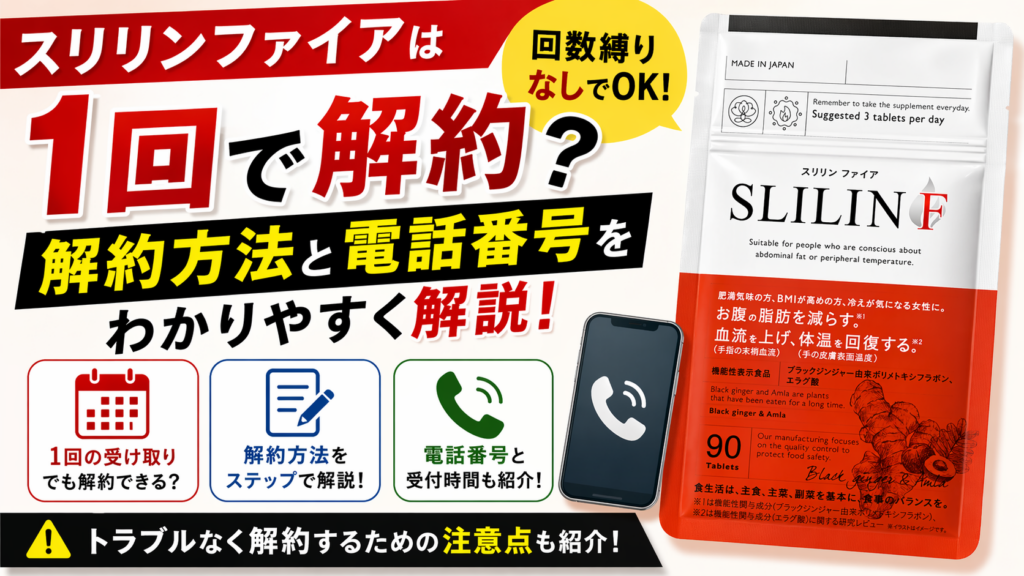 この記事では、スリリンファイアは本当に1回で解約できるのかという疑問をはじめ、解約方法や電話番号、解約時の注意点までわかりやすく解説します。 今回、紹介するスリリンファイアの定期コースは回数縛りがないため1回のみでも解約することが可能です。... -