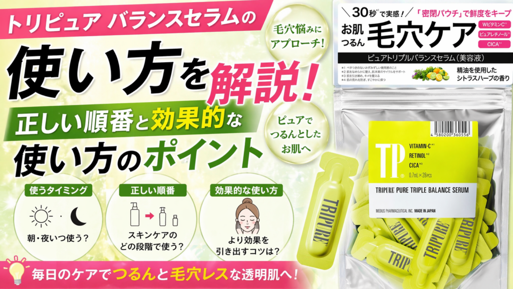 この記事では、トリピュア バランスセラムの使い方を解説します。 結論として、洗顔→化粧水→トリピュア バランスセラム→乳液・クリームの順番で使うのが基本です。 化粧水のあとに適量を手に取り、顔全体にやさしくなじませることで毎日のスキンケアに取り... -